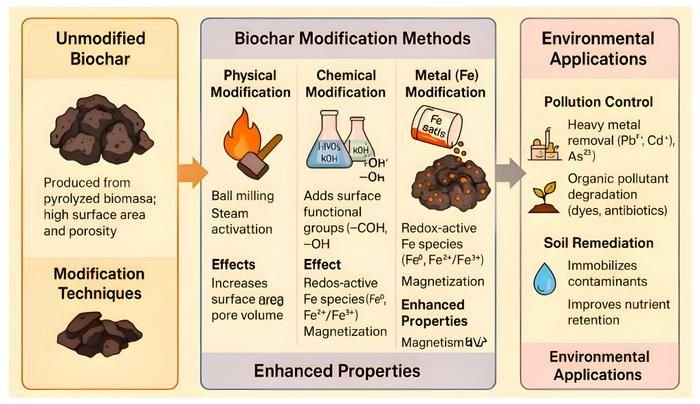Die Studie positioniert eisenfunktionalisierte Biokohle als kostengünstiges, multifunktionales Werkzeug für saubereres Wasser, gesündere Böden und resiliente Agrarsysteme.