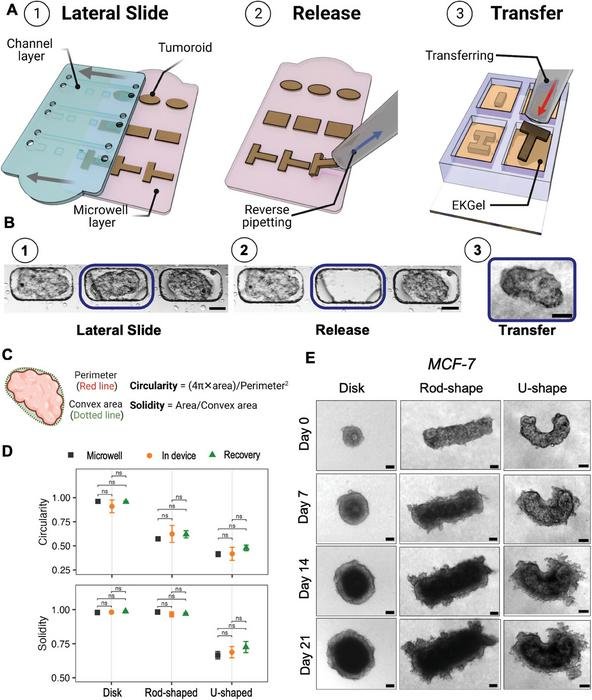 Die von Forschern der Universität Toronto entwickelte ReSCUE-Plattform ermöglicht auch die Bildung, Freisetzung und Übertragung von Tumoroiden, die vom Patienten stammen.