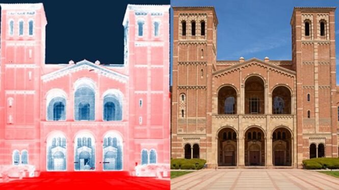 Ein thermisches Infrarotbild der Royce Hall der UCLA zeigt Strahlungswärme Die Fassade absorbiert Wärme weiß bis blassrot vom Boden rot während ein Teil der Wärme vom BodenGebäude in den kalten Himmel blau abgestrahlt wird