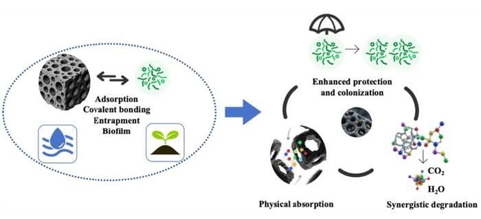 Der neue Ansatz nutzt „Biokohle“ – ein kohlenstoffreiches Material aus pyrolysierter Biomasse. Die poröse Struktur und Oberflächenchemie von Biokohle eignen sich ideal zum Binden von Schadstoffen und zur Schaffung von Mikrohabitaten für nützliche Mikroben. Mit schadstoffabbauenden Mikroben angereichert, wirkt Biokohle sowohl als schützender Träger als auch als Adsorbent. Dadurch können Mikroben überleben und ihre Leistungsfähigkeit steigern und gleichzeitig Giftstoffe effizient aus Wasser und Boden entfernen. Zu den jüngsten Fortschritten zählen nährstoffangereicherte Biokohle und künstlich erzeugte mikrobielle Gemeinschaften, die das Sanierungspotenzial weiter erweitern.