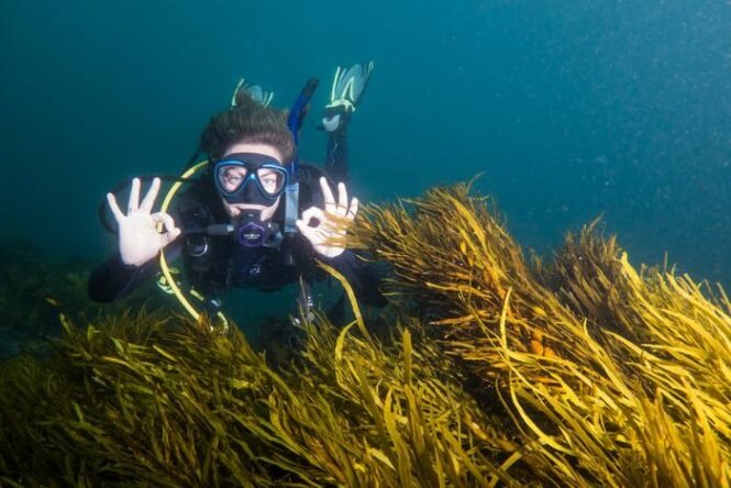 Flinders University researcher Dr Georgina Wood diving on crayweed restoration site in Sydney NSW