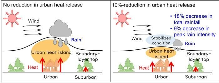 Beim Vergleich der Ergebnisse der Kontroll- und Sensitivitätssimulationen untersuchte das Team die Auswirkungen der Reduzierung der fühlbaren Wärmeströme über städtischen Gebieten auf die Intensität und Menge des Niederschlags in Osaka. Die Ergebnisse zeigen, dass die Reduzierung der Wärmeabgabe in städtischen Gebieten zu einer Abschwächung und Kontrolle lokaler Niederschläge an Sommernachmittagen führen kann.